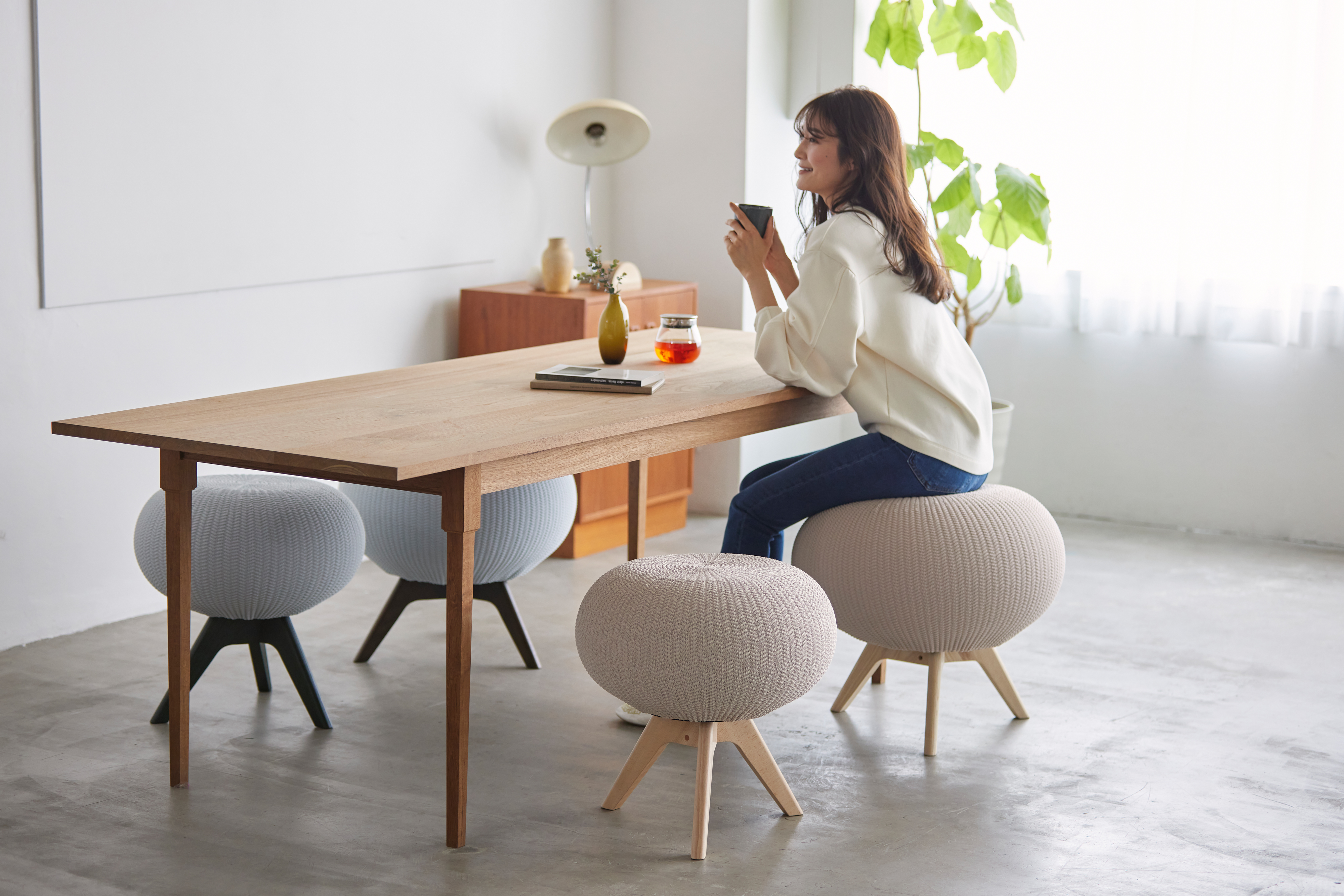 3D縫製によって編み上げたニット(ポリエステル100%)の座面は360度どこにも縫い目がありません。木脚には木目がはっきりと出るアッシュ材を採用しています。